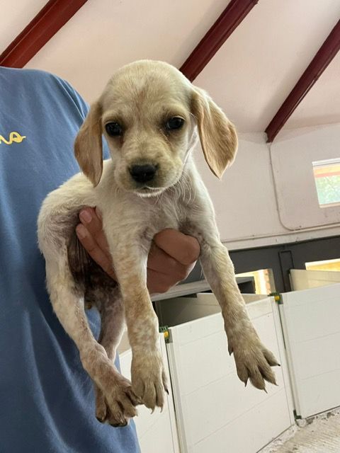 Dos cachorros machos (A y B) pointer y una hembra pointer , todos de aproximadamente mes y medio